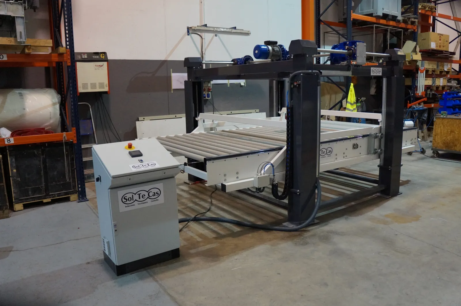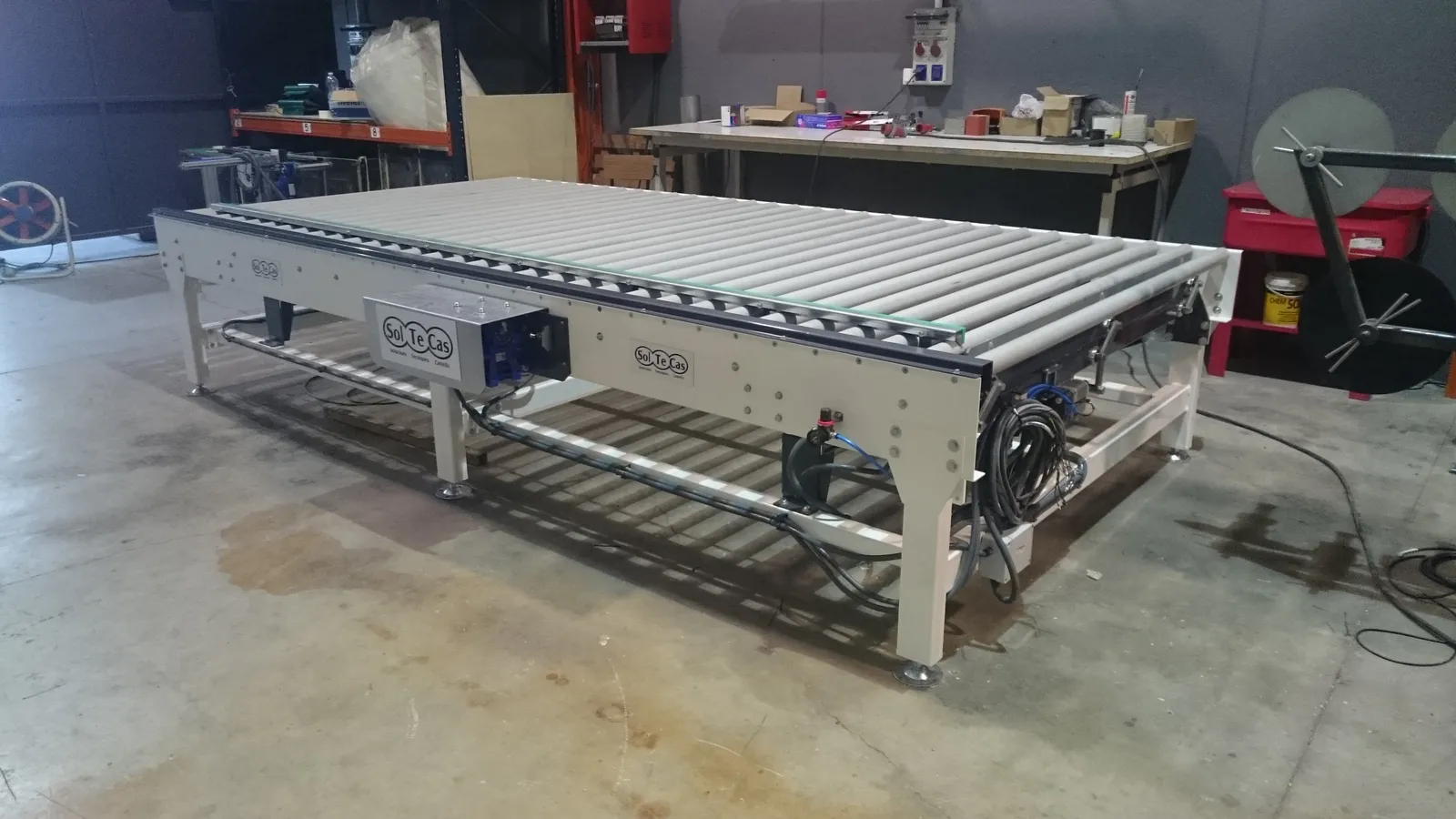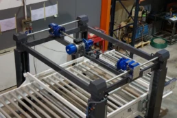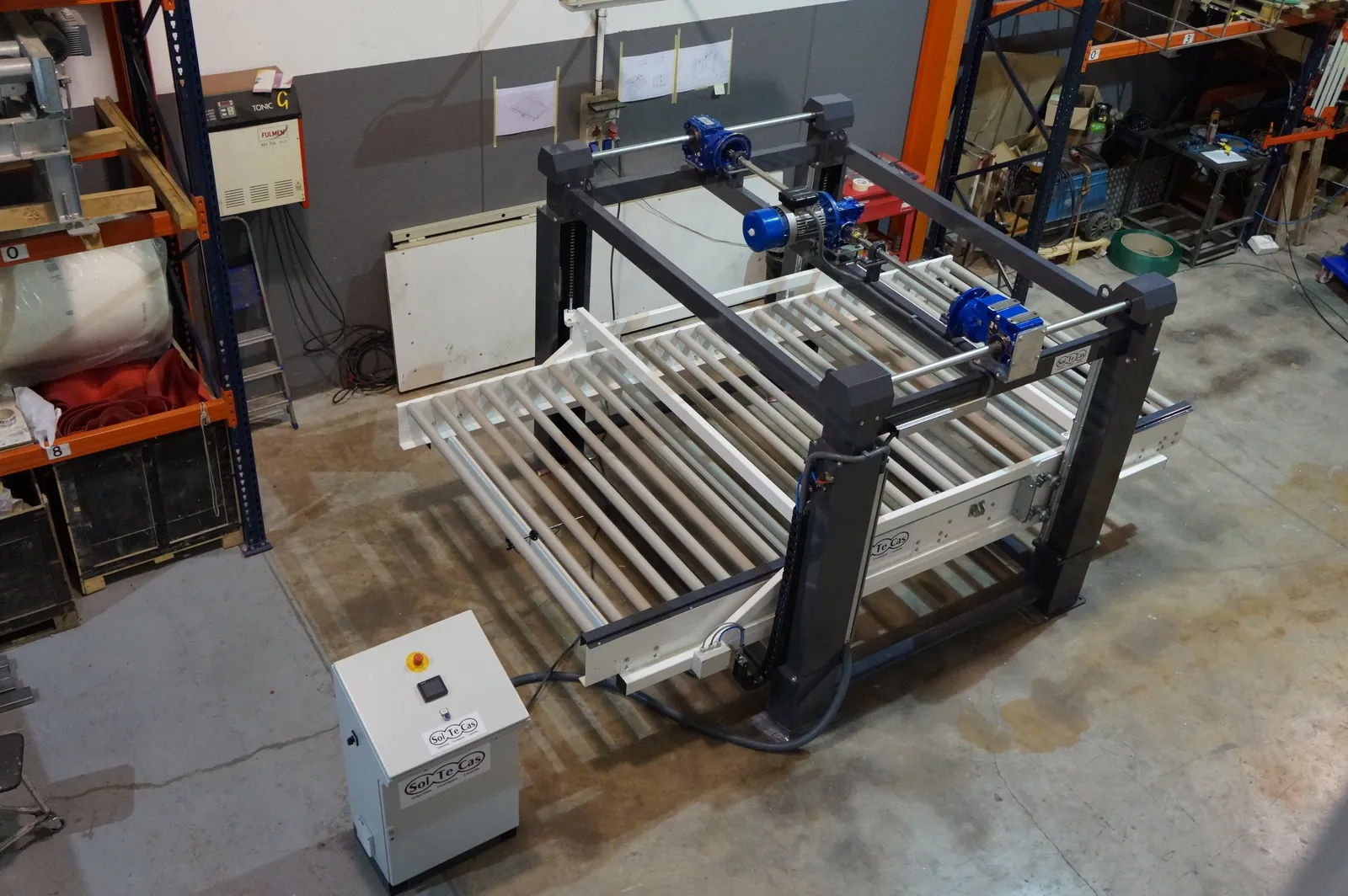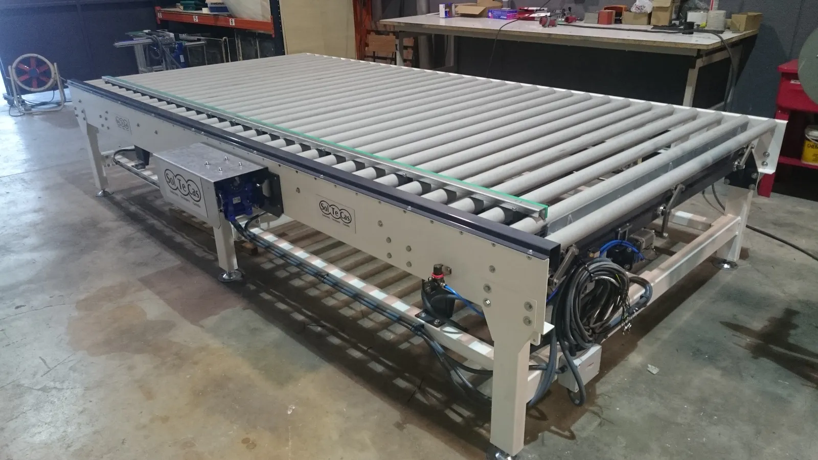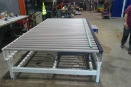 El sistema de rodillera centradora de grandes formatos diseñado por Solucions Tècniques Castelló está compuesto por una rodillera que dispone de un tope fijo final y un tope móvil lateral accionado mediante motorreductor permitiendo ajustar y centrar piezas de gran formato en la posición correcta de la línea.