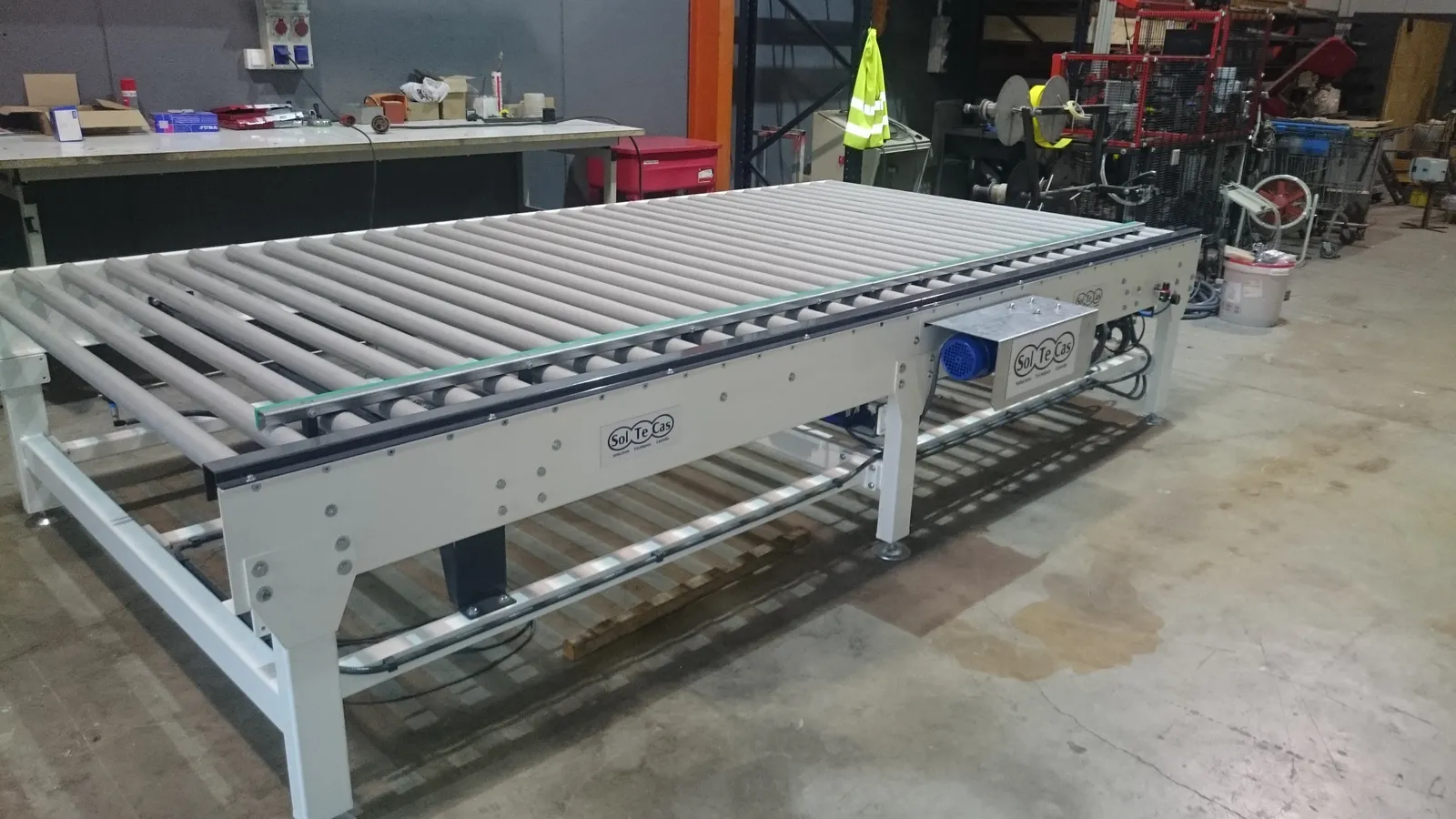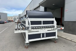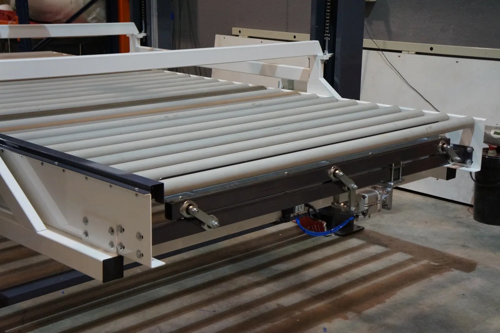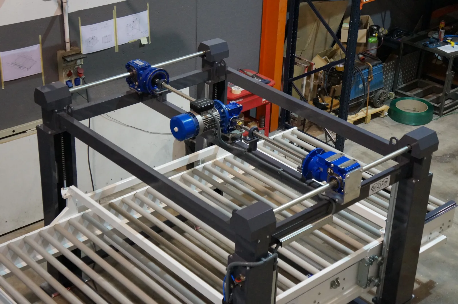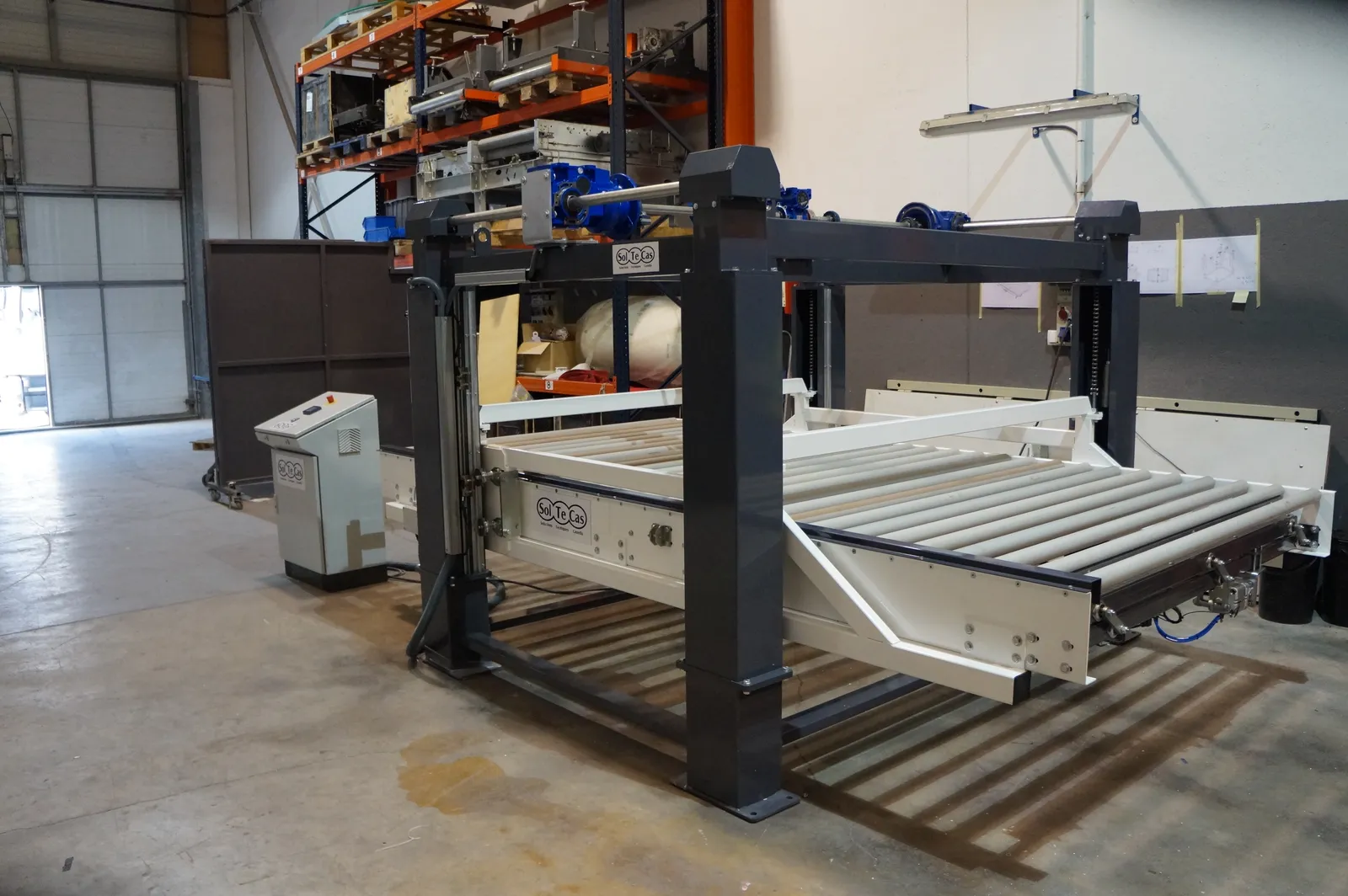 El sistema de rodillera centradora de grandes formatos diseñado por Solucions Tècniques Castelló está compuesto por una rodillera que dispone de un tope fijo final y un tope móvil lateral accionado mediante motorreductor permitiendo ajustar y centrar piezas de gran formato en la posición correcta de la línea.