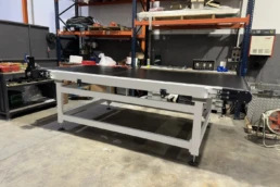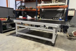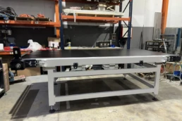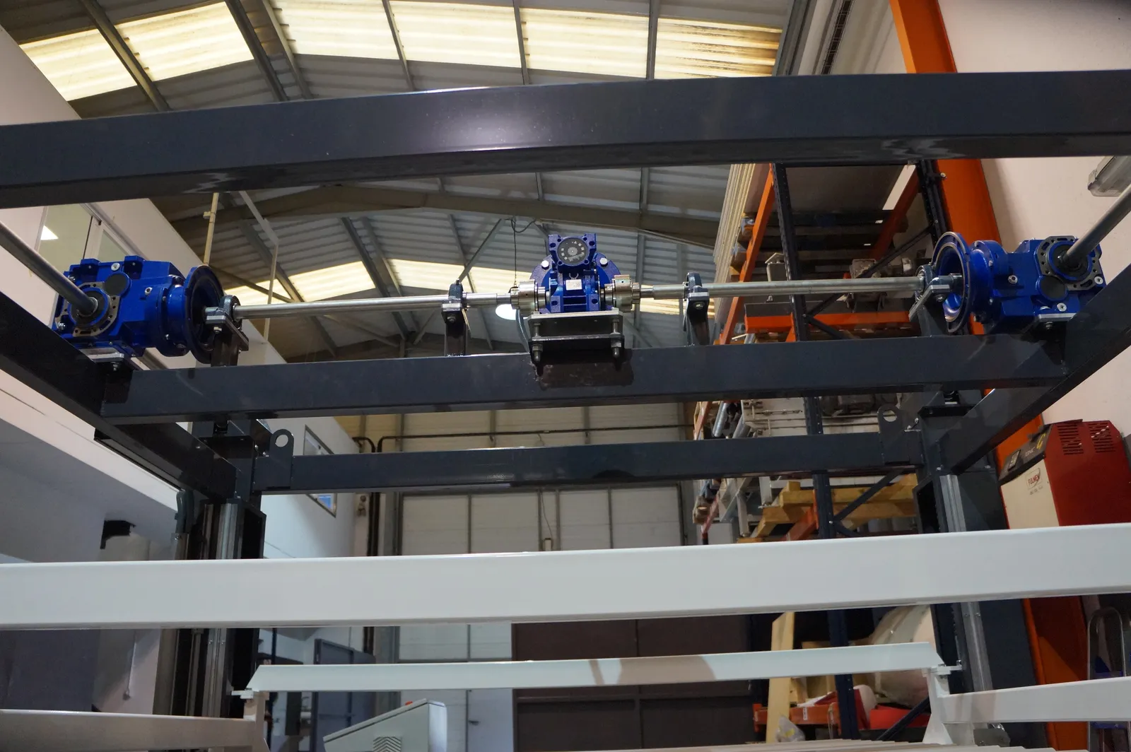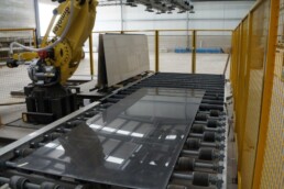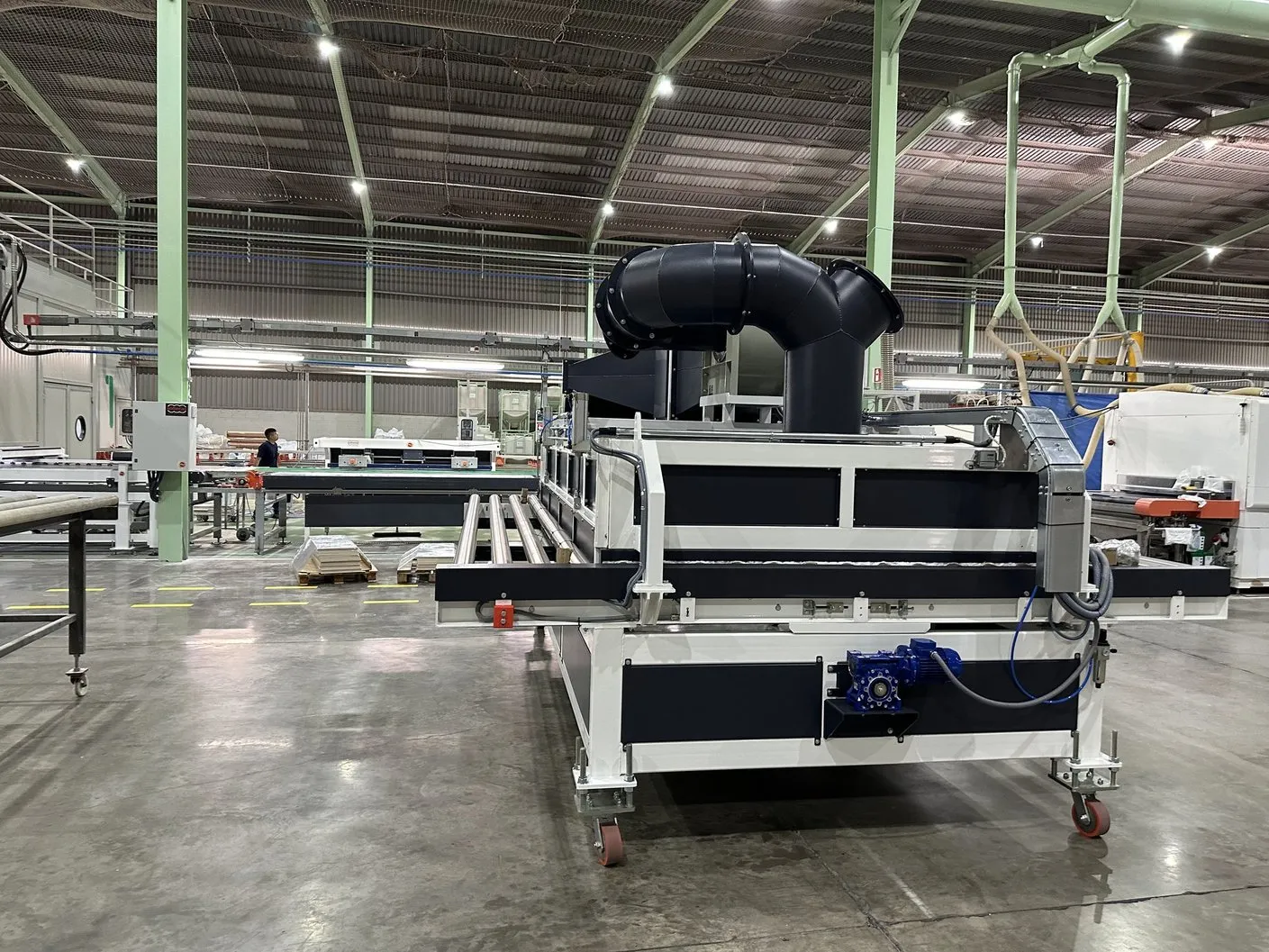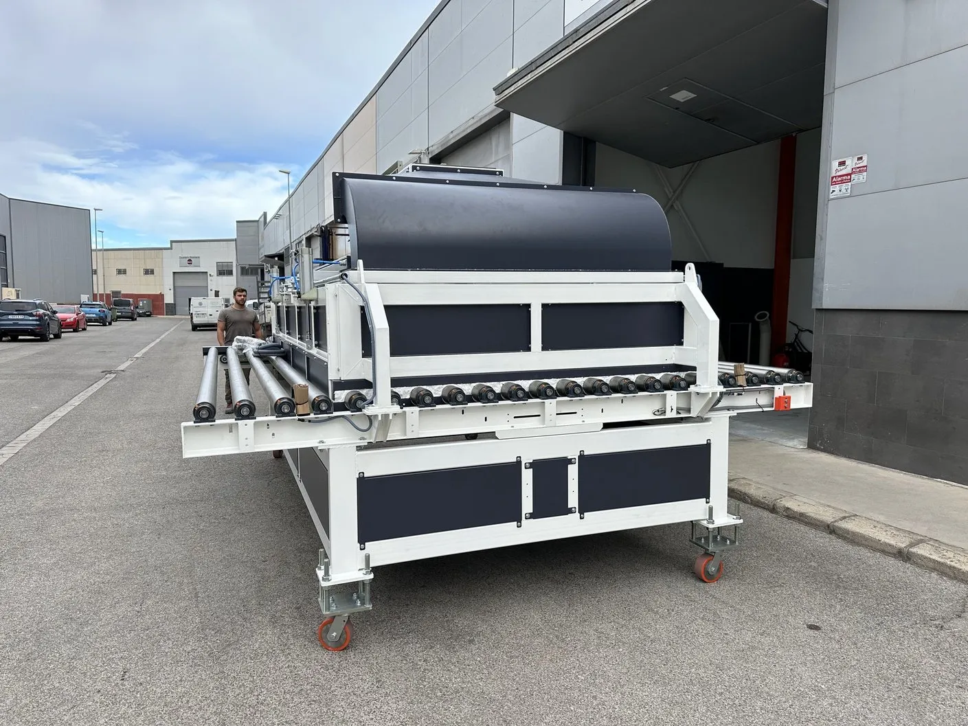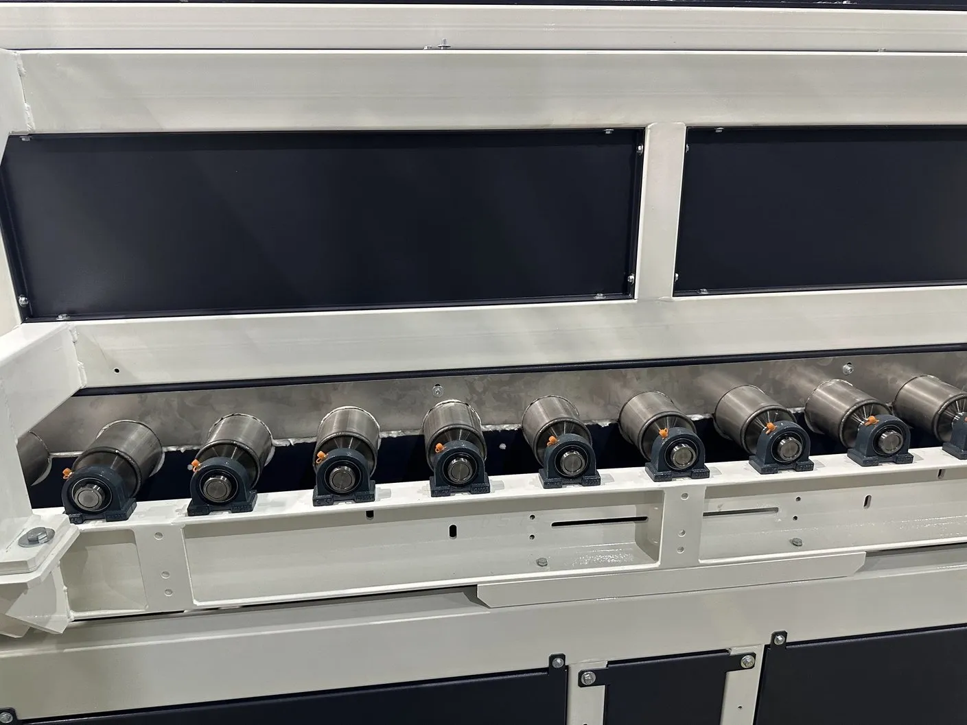 El sistema de rodillera centradora de grandes formatos diseñado por Solucions Tècniques Castelló está compuesto por una rodillera que dispone de un tope fijo final y un tope móvil lateral accionado mediante motorreductor permitiendo ajustar y centrar piezas de gran formato en la posición correcta de la línea.