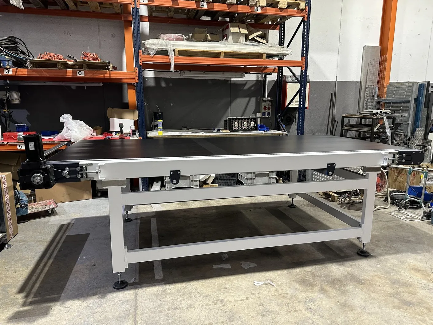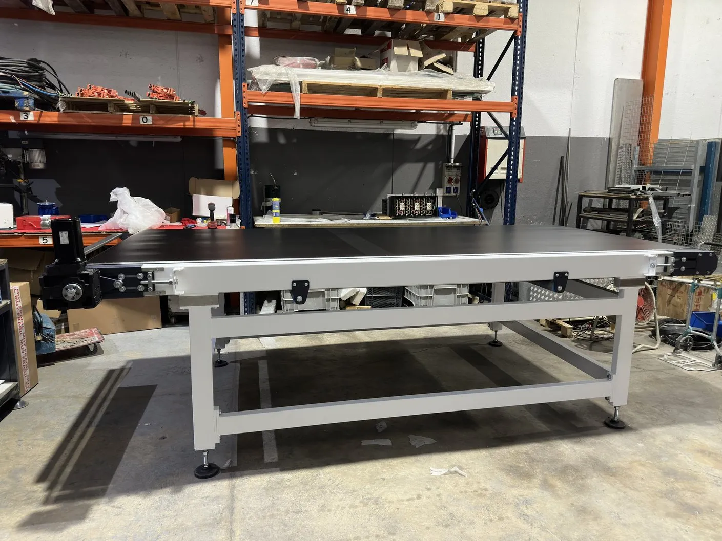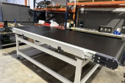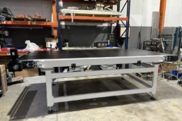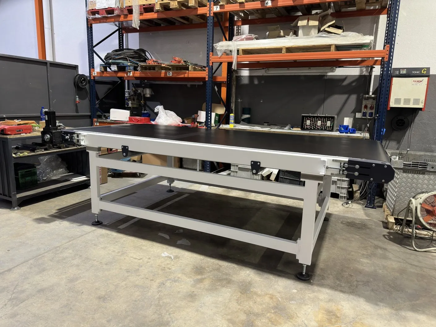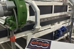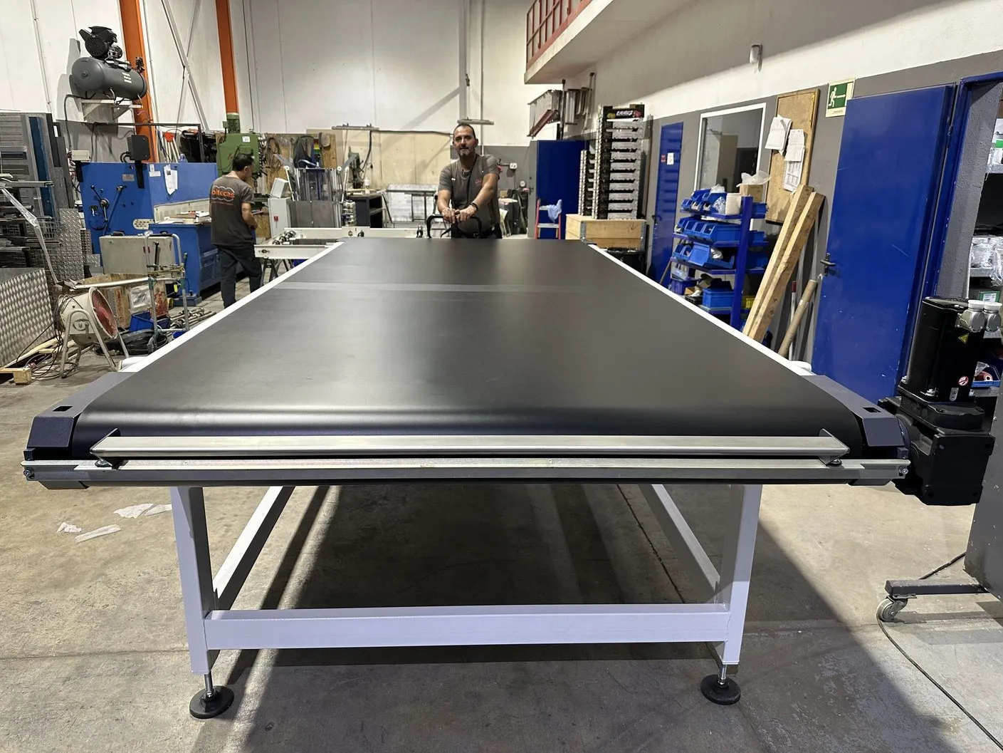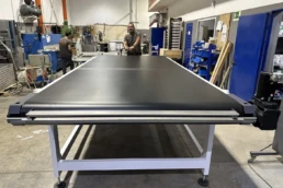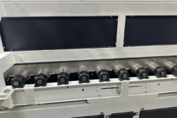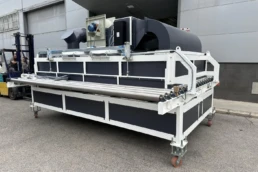 Máquina consistente en un transportador de banda sincronizado en velocidad con la máquina digital. Dicha sincronización se realiza con alta precisión al usar un servomotor con un reductor de juego reducido, de modo no se producen movimientos no deseados de la pieza en las transiciones. Se le pueden dar diferentes utilidades: se utiliza para sincronizar la velocidad de la pieza de gran formato cuando su longitud es mayor que la distancia entre el tambor de entrada y la primera batería de inyectores, se puede usar para realizar dobles pasadas, se puede usar para enlazar diferentes máquinas inkjet…