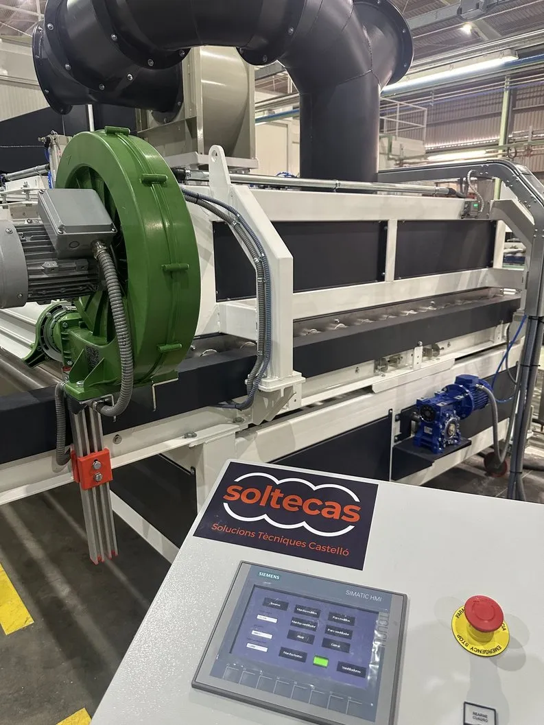 Máquina para precalentar las baldosas de gran formato bizcochadas antes de introducirlas a la línea. Consiste en un transportador de rodillos con una cámara central donde se eleva la temperatura del aire, para evitar fugas de aire dispone de tajaderas de entrada y salida de accionamiento neumático. La pieza se introduce en la cámara con el transportador de rodillos. Para elevar la temperatura del aire se dispone de una batería de resistencias, junto con un sistema de recirculación de aire para ir elevando la temperatura del aire hasta la temperatura deseada. Dicho aire entra en contacto con la pieza y comienza a elevar su temperatura; el control de la temperatura de la pieza se realiza mediante un pirómetro. Cuando alcanza la temperatura deseada, se saca la pieza de la cámara con la ayuda del transportador de rodillos.