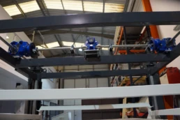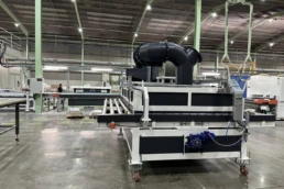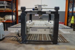 Máquina cuya función es la unión entre diferentes partes de la línea de transporte con diferentes alturas. Consiste en un transportador de rodillos motorizado, del tamaño necesario para que quepa una pieza completa de gran formato; dicho transportador está unido a un pórtico de elevación, el cual desplaza verticalmente el transportador hasta la altura deseada.