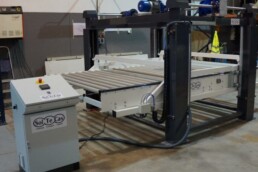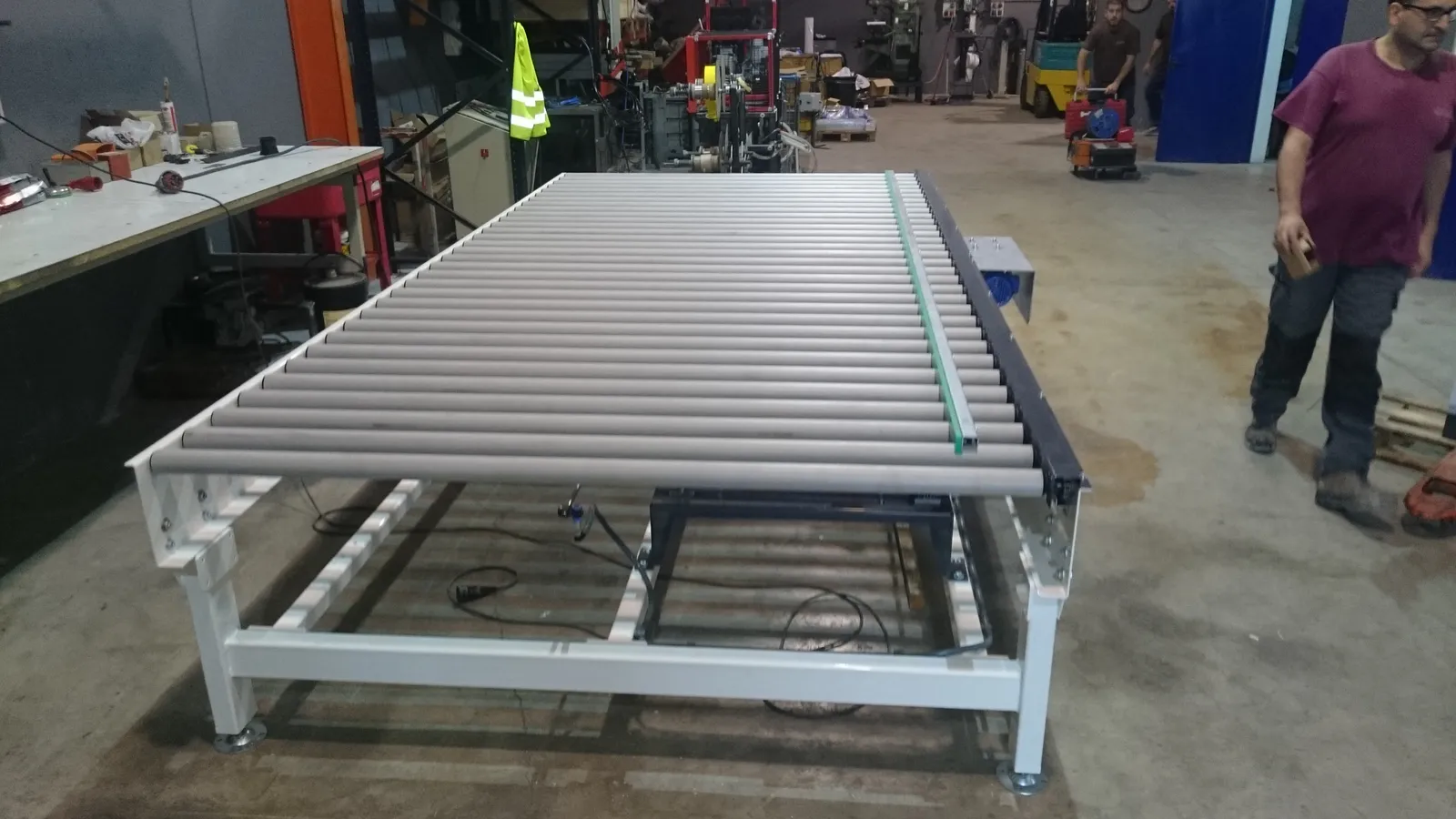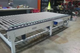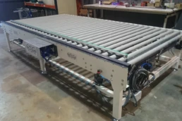Máquina diseñada para la alineación de piezas de gran formato. Consiste en un transportador de rodillos motorizado, con un desplazador móvil lateral. Dicho desplazador está también motorizado, de tal forma que se puede regular la posición de alineación de la pieza. Existe disponible una variante de esta máquina; transportador de rodillos con centrador. En este caso hay dos desplazadores laterales, que se mueven al unísono hacia la parte central de la rodillera, de modo que la pieza acaba centrada con respecto al transportador